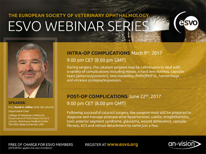 ESVO is proud to announce another webinar series. Last webinars were great and we received excellent feedback from our participants, that´s why we are back again. The new webinar is being held on March 9th, 2017, the topic is Intra-OP Complications. Speaker Prof. David A. Wilkie DVM, MS, DACVO.