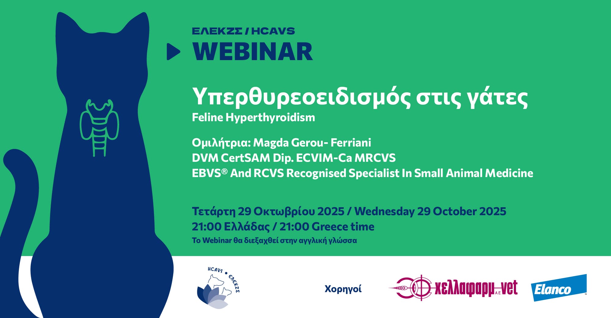 Στο πλαίσιο του διαρκούς προγράμματος μεταπτυχιακής εκπαίδευσης των κτηνιάτρων των ζώων συντροφιάς, η ΕΛΕΚΖΣ σε συνεργασία και με την αποκλειστική χορηγία της VELLADRAM AE Vet, διοργανώνει διαδικτυακό σεμινάριο (webinar), την Τετάρτη 29 Οκτωβρίου 2025 στις 9.00 το βράδυ, με θέμα: